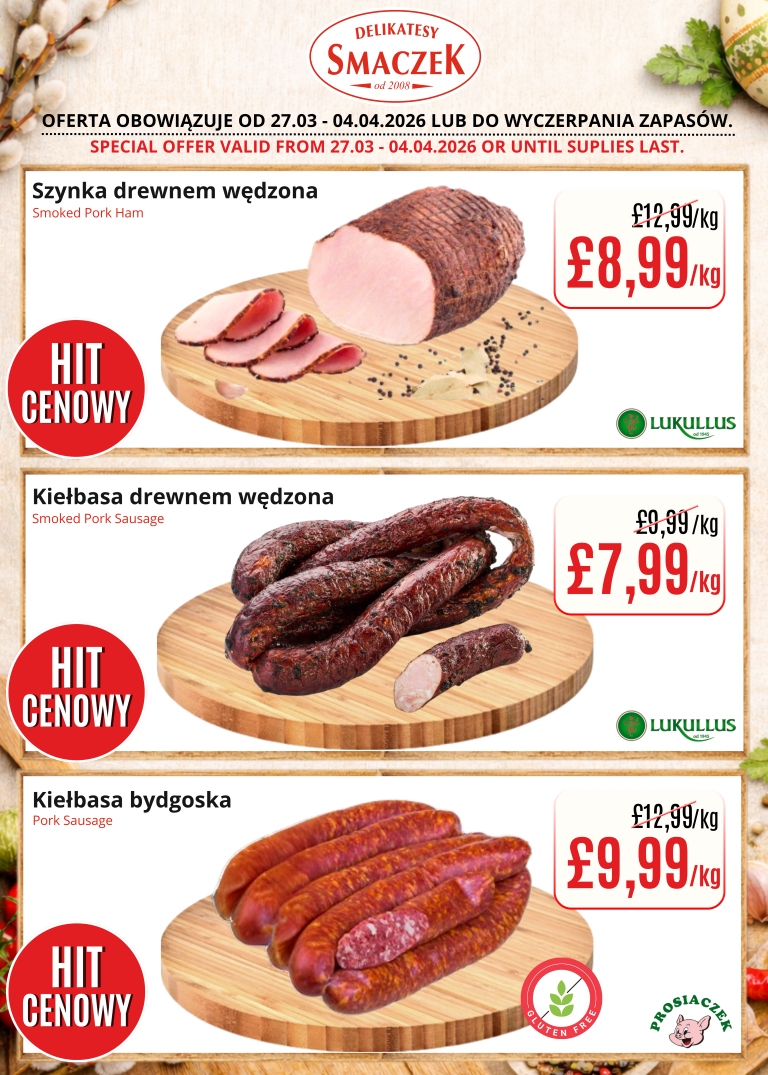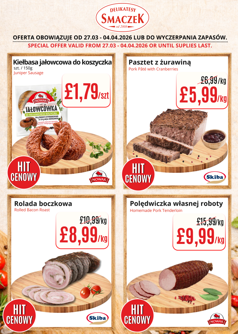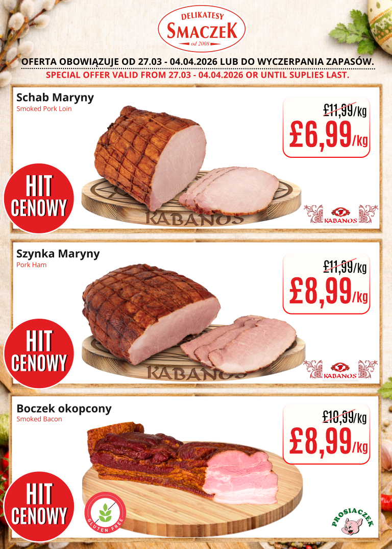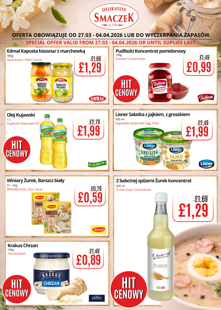We encourage you to regularly check the availability of our products and discover delicious alternatives at discounted prices. Come and experience the variety and freshness that we always offer at Delikatesy Smaczek. Discover a taste that delights and a price that convinces!
